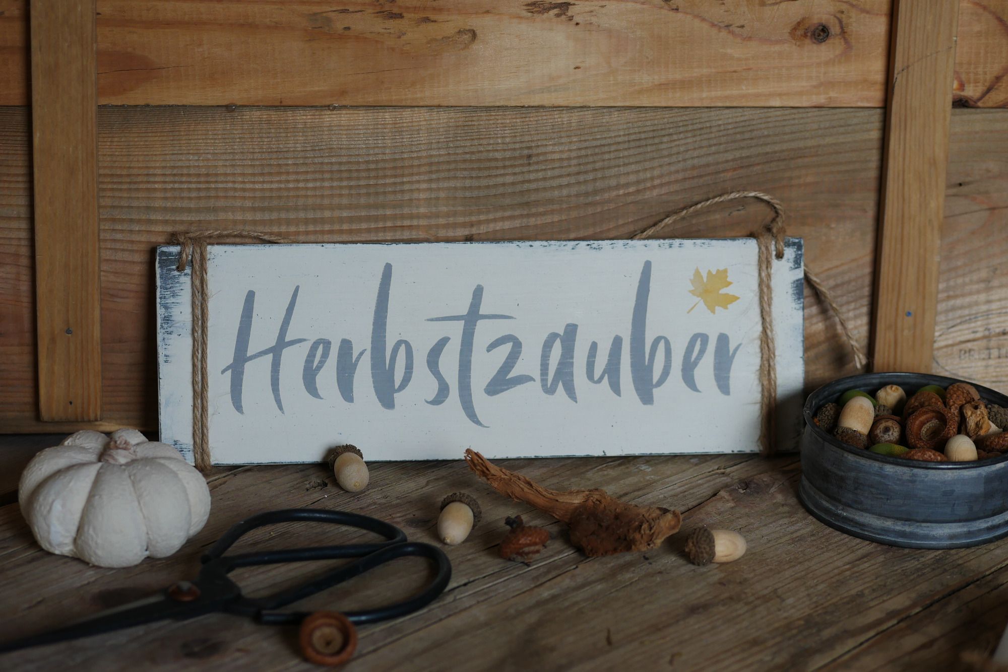 Dekoratives Herbstschild in shabbyweiß.